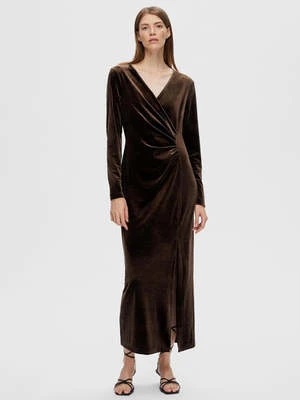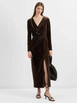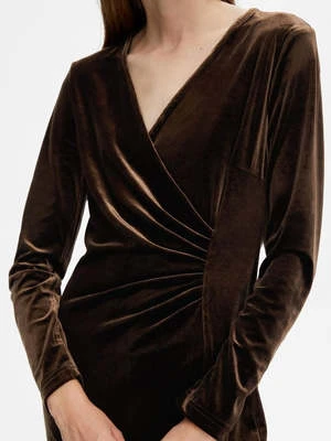 The Tara dress from Selected Femme is a statement velvet wrap dress. Crafted from soft velvet that has a luxurious glow to it. Featuring a delicate and elegant wrap front with a draped effect towards the waist.