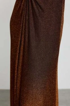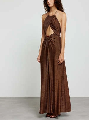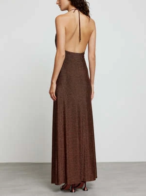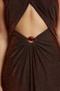 Understated elegance meets versatility in this free flowing silhouette ~ designed to make a statement, the Kyla Midi Dress in Bronze is a stand out. Halter neckline, gathered fabrication at the bust, front bodice cut out and resin bead detail.