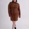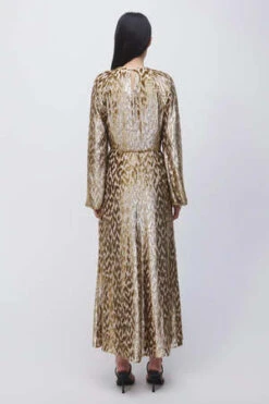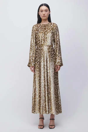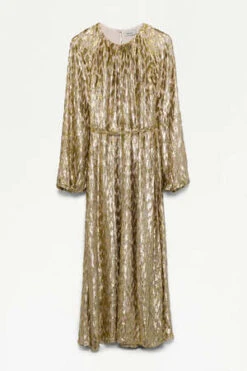 The Odina Dress in Gold. Lustrous design in a flowy, maxi silhouette with long sleeves and a gentle cinch at the waist. The definition of modest elegance.