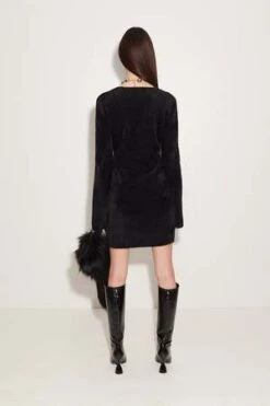 Knit mini dress made in our custom SIMON MILLER fuzzy nylon fabric. Featuring a scoop neckline, bell sleeves and flattering silhouette. Super luxe, comfy, soft, and cozy.
