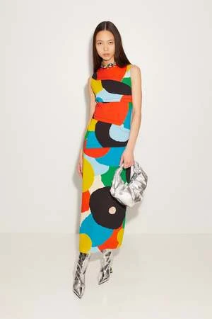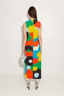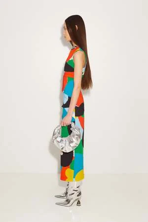 Sleeveless crepe dress made with a custom artisanal SimonMiller print. Embroidered top stitch and side slit.
