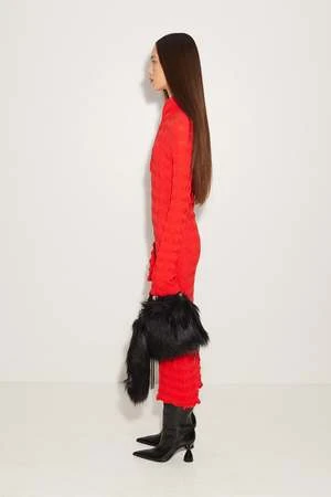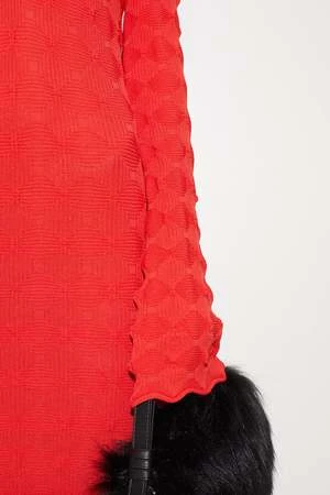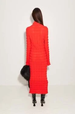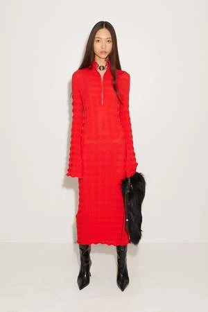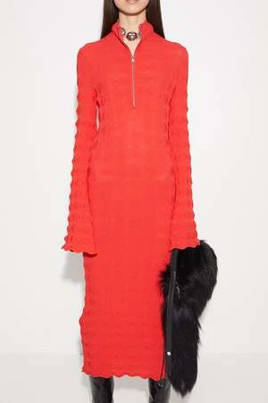 A-line style knit dress. Sculpted fit with flared sleeves and quarter zip collar. All over 3D bubble effect lightweight texture.