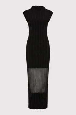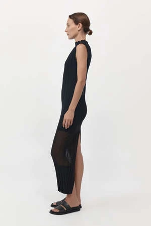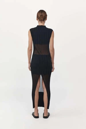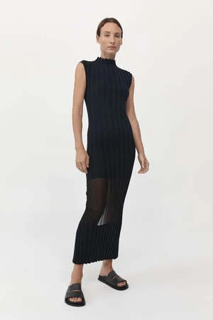 Refined and timeless, the Fine Pleat Knit Dress boasts a slim fit, mock neck, midi length, sheer panel detailing and striking back split. Crafted from a signature, finespun recycled viscose, the Fine Pleat Knit Dress is the perfect day-to-night, all occasion wardrobe hero for the streamlined, uniform dresser