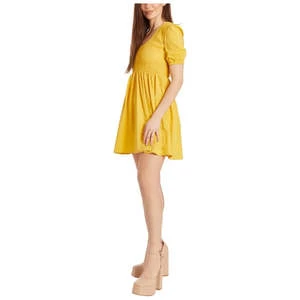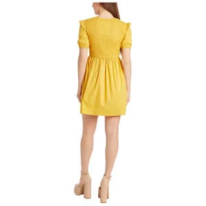 Honeycomb mini dress with smocked detailing, scoop neckline, and puff sleeves. Features classic fit and pullover style.