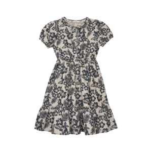 New from the New Society for Spring/Summer 2022 collection. Short sleeve hibiscus print dress in a navy/sand linen blend. Details include pouf sleeves, cinched waist, and tiered skirt.