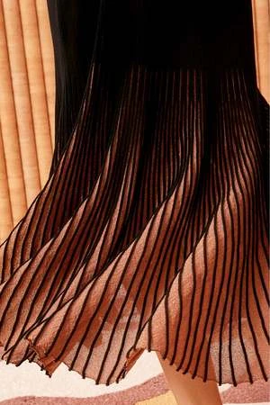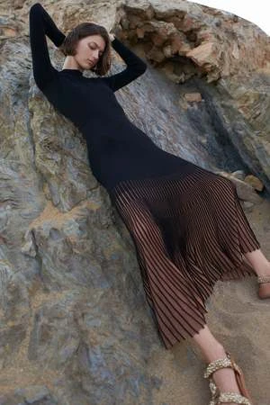 Defined by languid and elegant volumes, the Magnolia Dress is crafted from an ultrafine knit that evokes beautiful sunburst pleats. This long-sleeve black dress has a round neckline and unfurls to a midi-length hem that explodes with shimmering bronze hues.