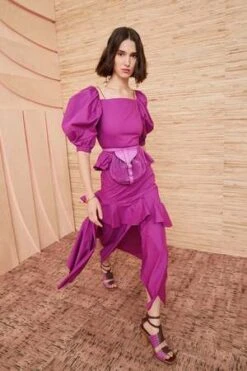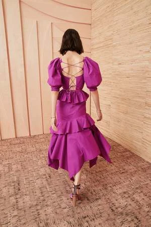 Marie Dress in Orchid was the perfect grand finale, a true stand-out in both hue and silhouette. Pin-thin lacing details the back, a beautiful juxtapose to the full, puff sleeves and sweeping ruffles along the skirt. Finished with a fixed waist and handkerchief hem.