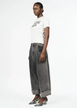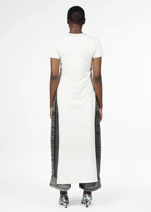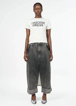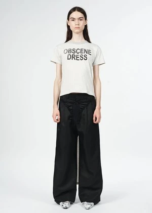SHORT SLEEVE GRAY COTTON JERSEY T-SHIRT WITH TRAIN IN BACK. RIB-KNIT CREWNECK COLLAR. OBSCENE DRESS GRAPHIC PRINTED ON FRONT.