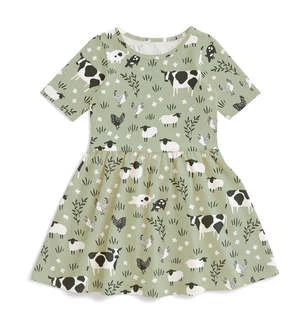 Her new favorite dress in our Farm Animals print, where cows and pigs and chickens enjoy being out in the fields.