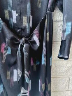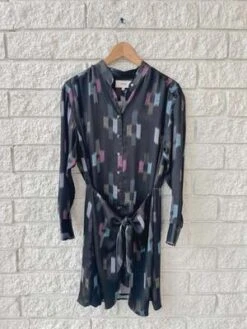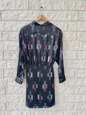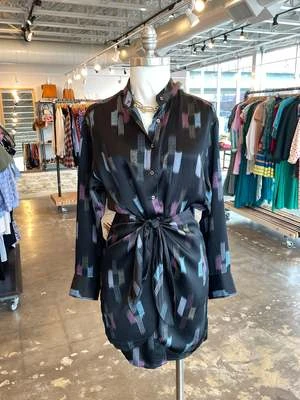 The Xirena Arly Dress in Black Ikat is a relaxed, mini dress with a vibrant pattern and lightweight material. Providing a sleek look, this button down dress has a waist tie to define the waistline.