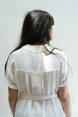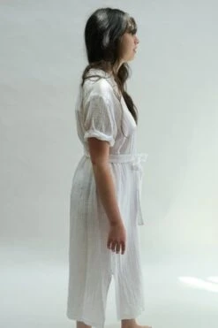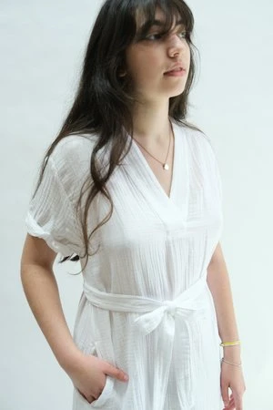 removable belt, pull on, v neck, modest side slits, pockets, short rolled sleeve