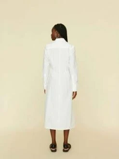 Banks is made in smooth and crisp cotton poplin. Banks is a form fitting shirt dress with a button-front, shirred waist, and back yoke.