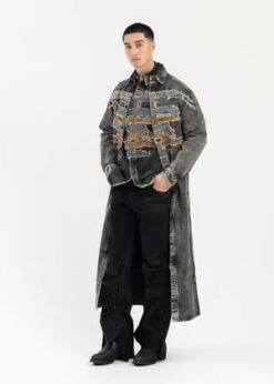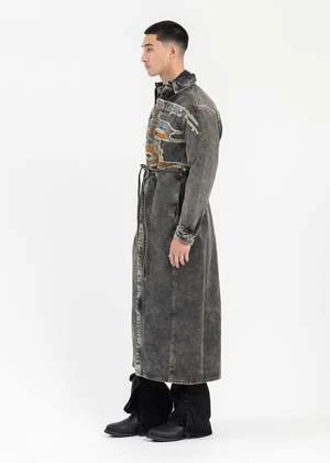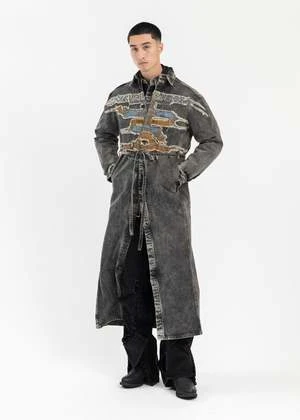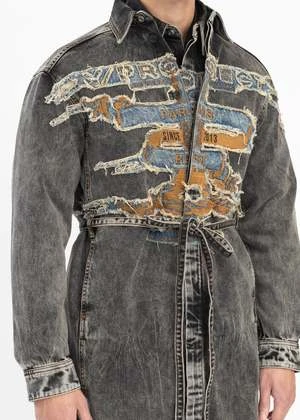 Paris’ best patch denim shirt dress in vintage black, from Y-Project. Paneled construction with a spread collar, dropped shoulders, elongated sleeves, and an integrated belt. Features a large contrast graphic across the front face. Finished with contrast stitch detailing, buttoned cuffs, and a leather logo patch at the nape.