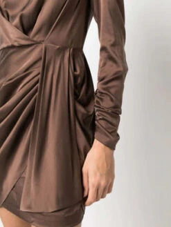 Zimmermann’s Silk Drape mini dress in chocolate brown featuring draped detailing, high neck and concealed rear zip fastening.